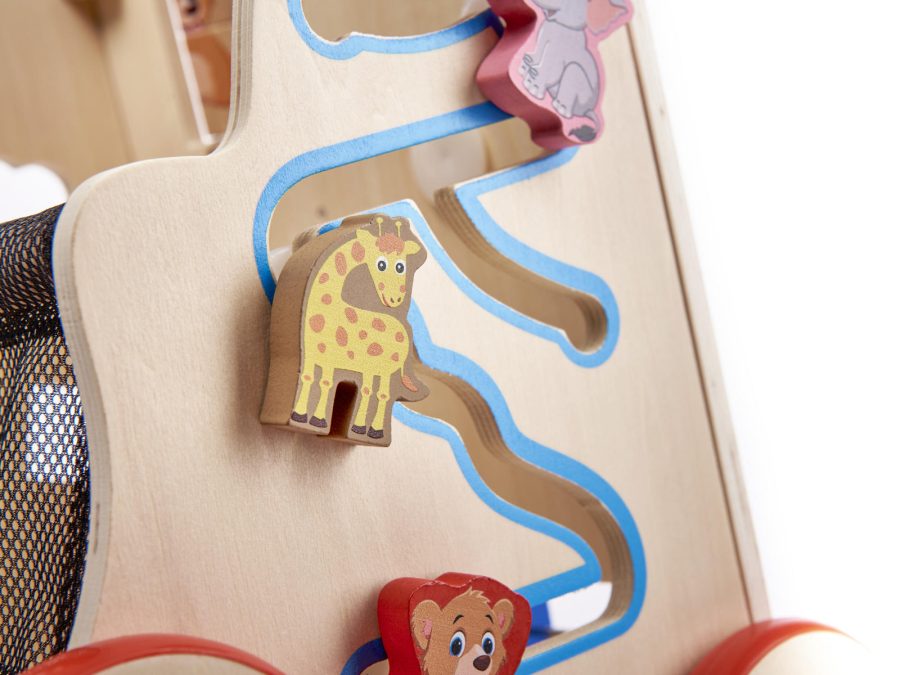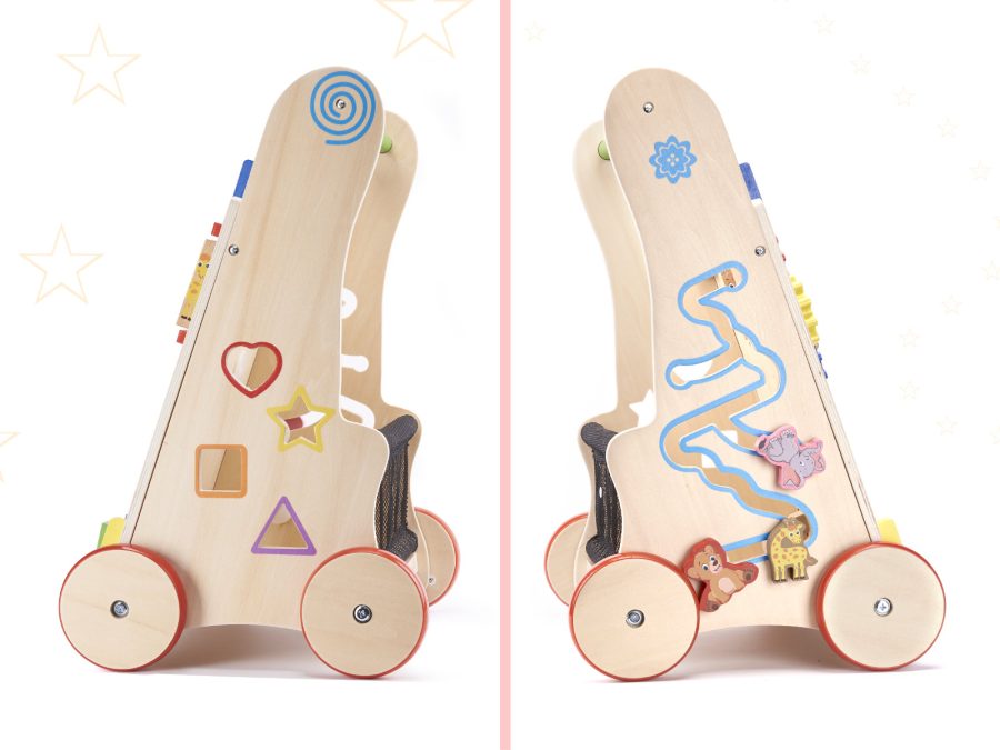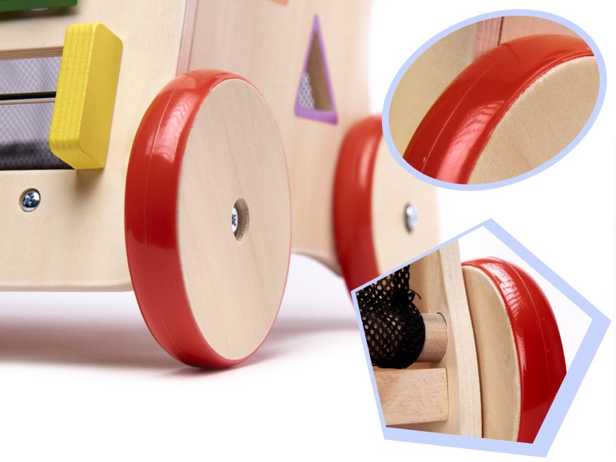 Osim što nudi mnoštvo aktivnosti, guralica može  poslužiti i  kao kutija u koju mališani mogu odlagati igračke i druge dodatke. Kotači su prekriveni protukliznim slojem, čime se osigurava stabilnost prilikom hodanja i sprečavaju nezgode. Svi elementi izrađeni su od pažljivo obrađenog drveta, bez oštrih rubova i obojeni ekološkim, netoksičnim bojama, što čini ovu guralicu apsolutno sigurnom za korištenje.