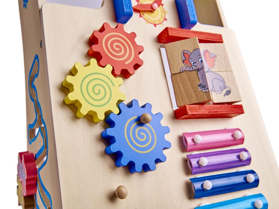 Na prednjoj strani hodalice nalazi se ploča prepuna elemenata koji će oduševiti svakog mališana. Tu su sat s pokretnim kazaljkama za učenje vremena, cimbale s palicom za prve glazbene avanture, puzzle s tri slike koje potiču rješavanje problema, te mali “telefon” s tipkama koji se može skinuti s ploče i koristiti za igru.