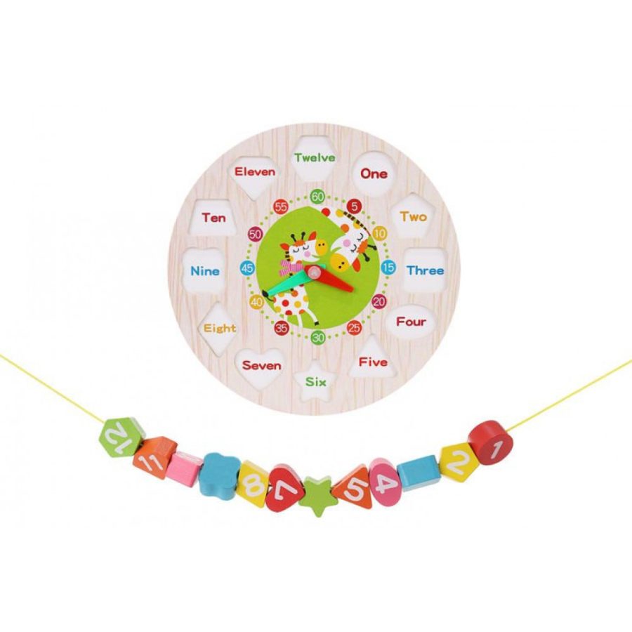 Ovaj šareni drveni sat ne samo da pomaže djeci učiti brojeve i prepoznavati oblike, već ih uči i brojeve na engleskom jeziku! Ovaj zabavni set sadrži pomične kazaljke i uklopive oblike. Savršen je za razvoj koordinacije oko-ruka i učenje vremena.