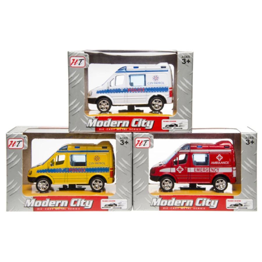 Igračka vozilo hitne pomoći u crvenoj ili policije u bijeloj ili žutoj boji, osim zabave, pomaže razvoju fine motorike i prostorne orijentacije te razumijevanje važnosti pomaganja drugima. Dužina vozila je oko 8 cm.
