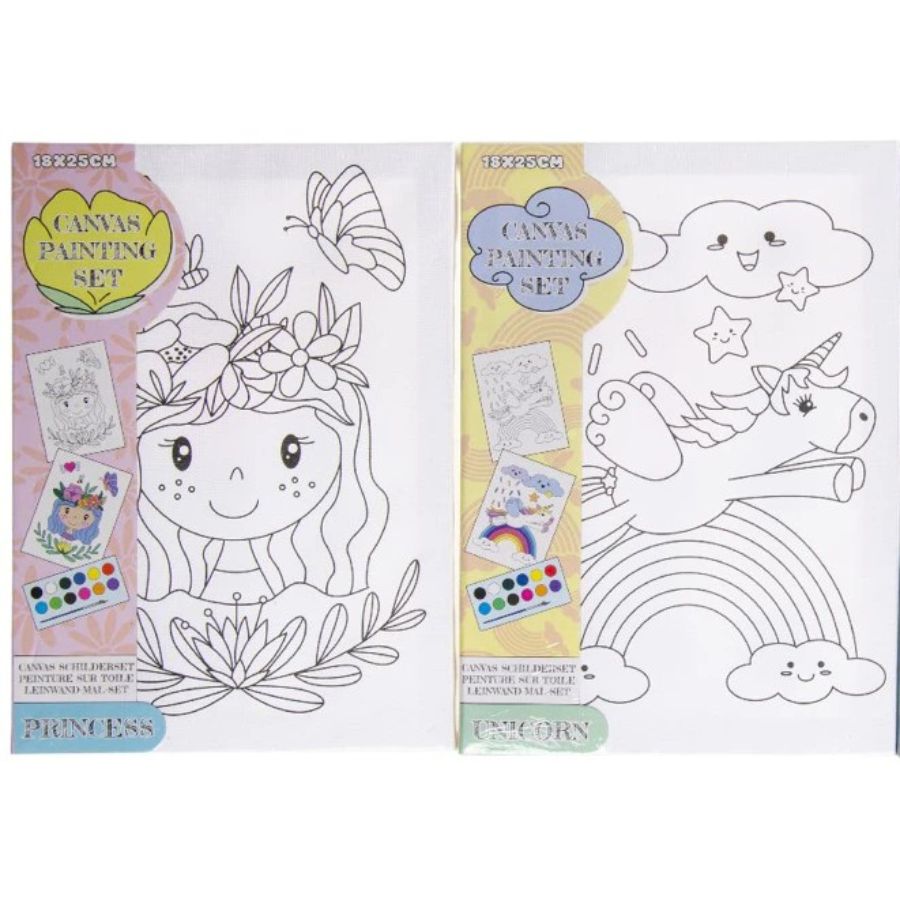 Set se sastoji od pravog umjetničkog platna (18×25 cm) napetog na drveni okvir, 12 nijansi vodenih boja i kista. Platno je spremno za oslikavanje na jednom od nekoliko različitih predložaka. Možete odabrati onaj motiv za koji ćete znati da će najviše razveseliti vaše dijete.